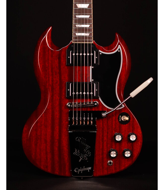 The 1964 SG™ Standard with Maestro™ Vibrola™ recreates one of the most beloved SG model years of all time–the 1964 SG Standard. While the 1964 SG Standard was famously used by such notable players as George Harrison and Eric Clapton, the model year was a standout for the SG in general. By 1964, the less intuitive Sideways Vibrato had been replaced with the dependable Maestro Vibrola, while the neck profile increased in size somewhat from the ultra-thin neck profiles found on some of the earlier SG models, and the SG’s balance, playability, and look seemed to come into its own. 1964 was also the first full year that the SG dispensed with the Les Paul moniker it previously used. Now, Epiphone is proud to release the 1964 SG Standard Reissue with Maestro Vibrola, a stunning recreation of that legendary model. Made in collaboration with Gibson™ Custom, the Epiphone 1964 SG Standard with Maestro Vibrola is the most authentic recreation of the 1964 SG Standard ever released by Epiphone. All of the classic appointments the 1964 SG Standard model is known and loved for are present here, including a one-piece mahogany neck with a long neck tenon for increased stability and sustain, a comfortable, fast-playing SlimTaper™ profile, and a bound rosewood fretboard. It also features mother-of-pearl trapezoid fretboard inlays, an aged mother-of-pearl Epiphone headstock logo, and an aged mother-of-pearl Gibson crown headstock inlay on the Gibson-style “open book” headstock. The center-seamed, two-piece mahogany body features the comfortable and distinctive bevels that help define a vintage-style SG and make it so comfortable to hold and play. The electronics are equally impressive, with two USA Gibson Custombucker humbucking pickups with Alnico 3 magnets that are hand-wired to CTS® potentiometers, Black Beauty paper-in-oil capacitors, and a Switchcraft® pickup selector toggle switch and output jack. The Vintage Gloss finish is nicely complimented by the nickel hardware, including Epiphone Vintage Deluxe “Double Ring” tuners. A black hardshell case with Inspired by Gibson Custom graphics, gold hardware, and a goldenrod interior is also included.