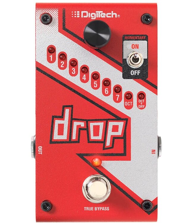 The DigiTech® Drop is a dedicated polyphonic drop tune pedal that allows you to drop your tuning from one semitone all the way down to a full octave. Get down-tuned chunk without having to change guitars! The Drop also features a momentary/latching switch. With the switch set to momentary, you can turn the Drop into a true performance pedal. Fast trills and roller-coaster pitch dips are at the tip of your toes.