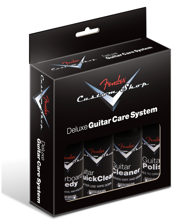 The Fender® Custom Shop Deluxe Guitar Care System is a convenient package that contains one bottle of each Fender Custom Shop Guitar Care product: Cleaner, Polish, Quick Clean and Fingerboard Remedy.