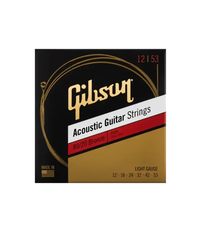Gibson 80/20 Bronze Acoustic Guitar Strings offer a bright, lively acoustic tone with excellent clarity and projection. Made with a durable steel core and 80/20 bronze wrap wire, they deliver crisp highs and balanced response that work well for both strumming and fingerstyle playing. The light 12–53 gauge provides a comfortable feel with a great balance of tone and tension.