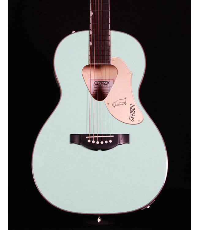 The Fishman® Isys III pickup/preamp system provides a modern sonic complement to classic touches including a solid spruce top with maple back and sides, gold sparkle neck and body binding, Neo-Classic™ "thumbnail" fingerboard inlays, a gold plexi pickguard, "vertical wing" Gretsch headstock logo, and more.