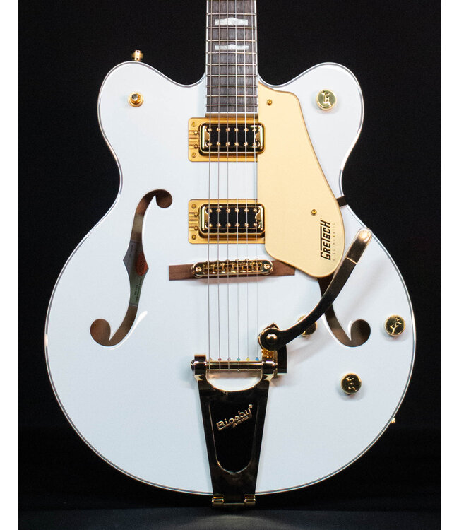 The G5422TG Electromatic® Classic Hollow Body Double-Cut with Bigsby® and Gold Hardware features a laminated maple body with vintage-inspired perimeters and refined arches, as well as all-new trestle block bracing to help reduce unwanted feedback. By increasing rigidity and contact between the top and back of the body, the new trestle block design also results in the sound having a faster attack with more focus, snap, and increased sustain. Coupled with all-new FT-5E Filter’Tron™ pickups, this hollow build’s voice explodes with huge full-bodied punch, classic chime and enhanced presence, clarity and note definition.