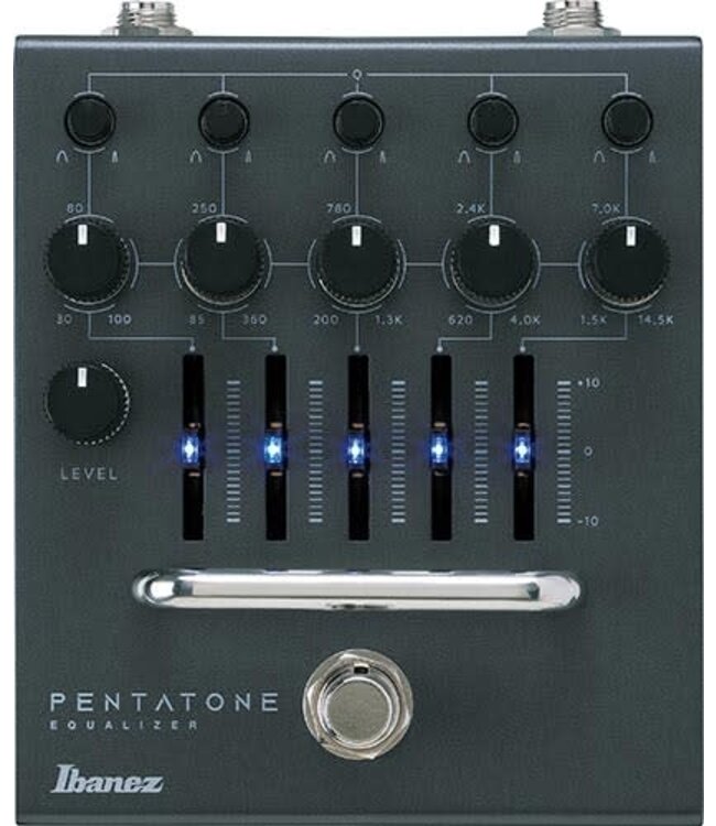 The Pentatone Equalizer is a standalone version of the 5-band equalizer section in the Ibanez Pentatone Preamp. Adding a continuously variable Q control on each band, which allows for a wider variety of sound creation, enables even more detailed sound creation. Furthermore, the ±9V power supply circuitry provides a wide headroom.