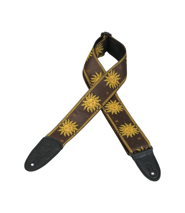 2″ sun design jacquard weave guitar strap with garment leather backing, genuine leather ends, and tri-glide adjustment. Adjustable to 57″.