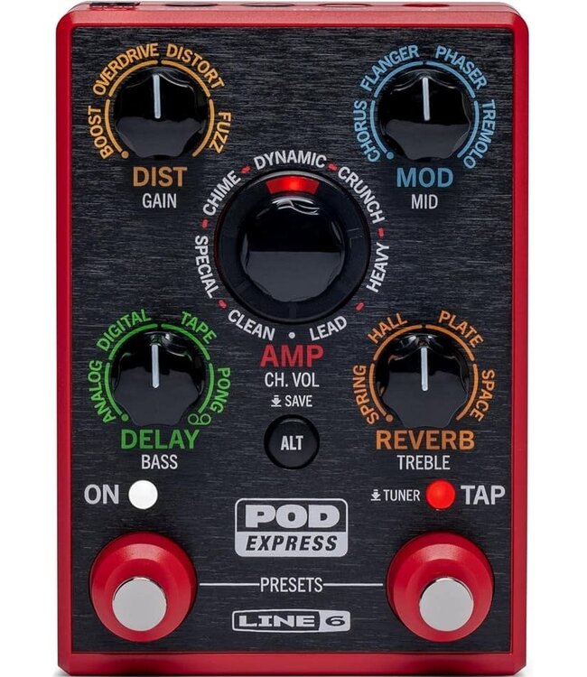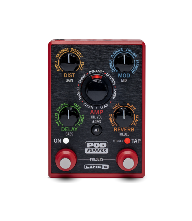 POD® Express Guitar is an ultra-portable amp and effects processor that enables guitarists to take their tones wherever they choose. Simple controls make it easy to use, while models derived from the HX® family of processors ensure exceptional sound quality and authentic feel. POD Express Guitar gives guitarists seven amps, seven cabs, and 17 distortion, modulation, reverb, and delay effects—including a looper—and it may be powered by three AA batteries (included) or an optional 9-volt power supply.