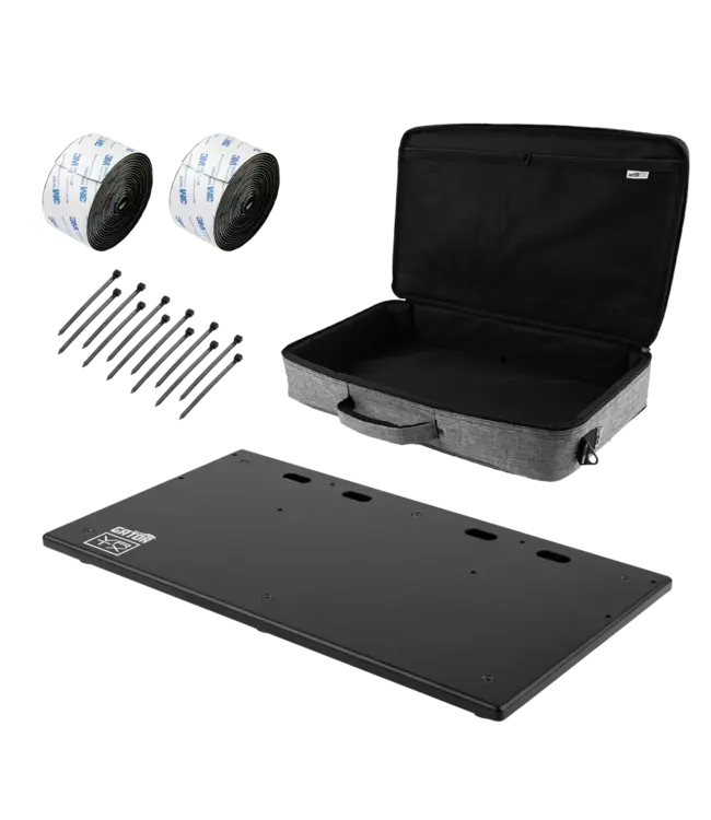 The Vertex By Gator GV-TC2313-GB Tour Compact pedalboard is a lightweight yet rugged 23” x 13” pedalboard built for musicians who need reliability on stage or in the studio. Constructed with a durable 8-gauge aluminum frame and finished with a non-textured powder coat, it allows precise self-fastener placement with a reliable, long-lasting hold. The wide platform holes provide easy access to cables, making cable management a breeze. Other features of the pedalboard include non-slip rubber feet, which provide maximum stability, as well as smooth, rounded edges and corners for safer handling. The included gig bag includes weather-resistant 600D nylon in light grey with 20mm foam padding to provide cushion and protect your pedalboard from impact. Other features of the gig bag include large storage pockets on the inside and outside for additional storage, heavy-duty YKK zippers for dependable durability, a comfortable reinforced padded handle, and D-rings for secure, comfortable transport with a shoulder strap. Also included 10′ rolls of both hook and loop fastener and 12 4″ cable ties.